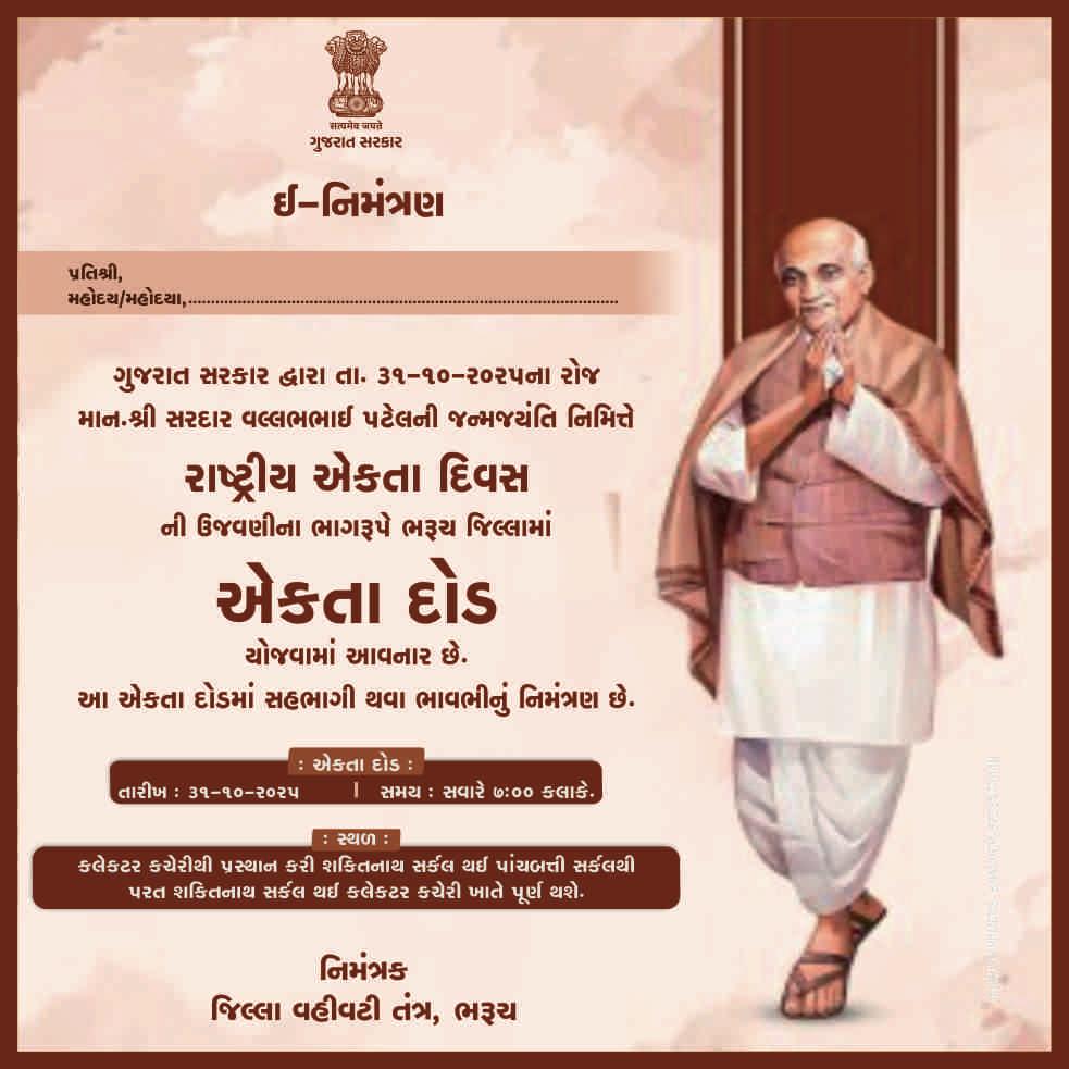 આ કાર્યક્રમ તારીખ ૩૧ ઑક્ટોબર, ૨૦૨૫ના રોજ, શુક્રવારના દિવસે, સવારે ૭:૦૦ વાગ્યે યોજાશે. કાર્યક્રમનો પ્રારંભ કલેક્ટર કચેરી, ભરૂચથી થશે, જે શક્તિનાથ સર્કલ – પંચબત્તી સર્કલ થઈને ફરી કલેક્ટર કચેરી ખાતે સમાપ્ત થશે. તેમજ સરદાર વલ્લભભાઈ પટેલની જન્મ જયંતી નિમિત્તે “રાષ્ટ્રીય એકતા દિવસ” તરીકે ઉજવવા તથા પ્રતિજ્ઞા લેવામાં આવનાર છે.