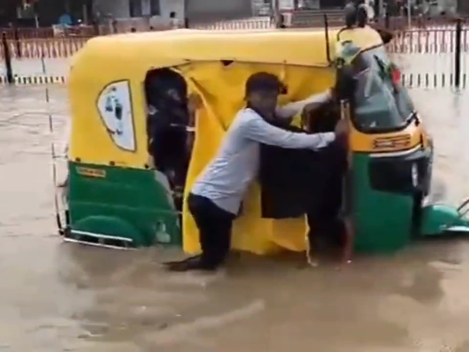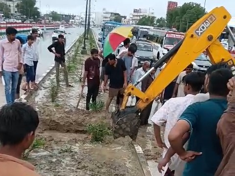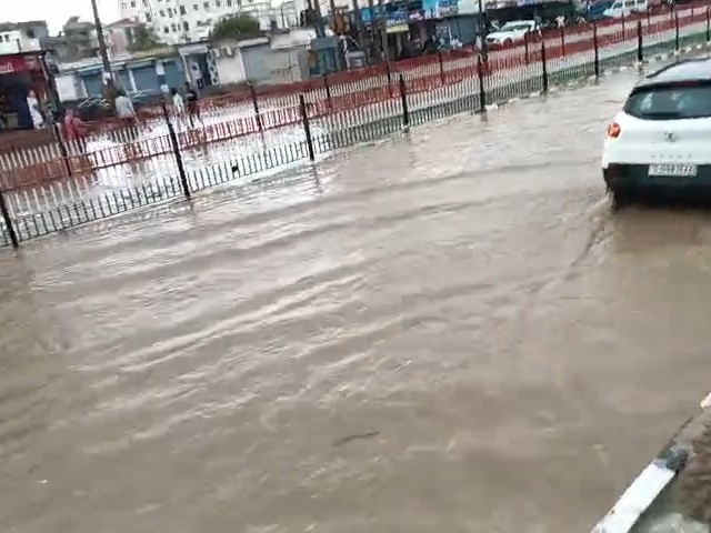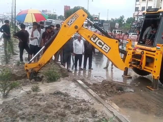 બે ઇંચથી વધુ વરસાદથી વાહનો બંધ પડ્યા, JCBથી ડિવાઈડર તોડી પાણીનો નિકાલ કરાયો
