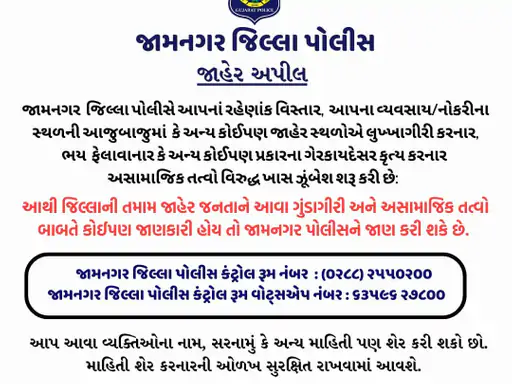 નાગરિકો માહિતી આપવા માટે જામનગર જિલ્લા પોલીસ કંટ્રોલ રૂમના નંબર (૦૨૮૮) ૨૫૫૦૨૦૦ અને વોટ્સએપ નંબર ૬૩૫૯૬-૨૭૮૦૦ નો સંપર્ક કરી શકે છે. માહિતી આપનાર વ્યક્તિની ઓળખ ગુપ્ત રાખવામાં આવશે. પોલીસની કડક કાર્યવાહીના પગલે અનેક અસામાજિક તત્વો શહેર છોડીને ભાગી ગયા છે.