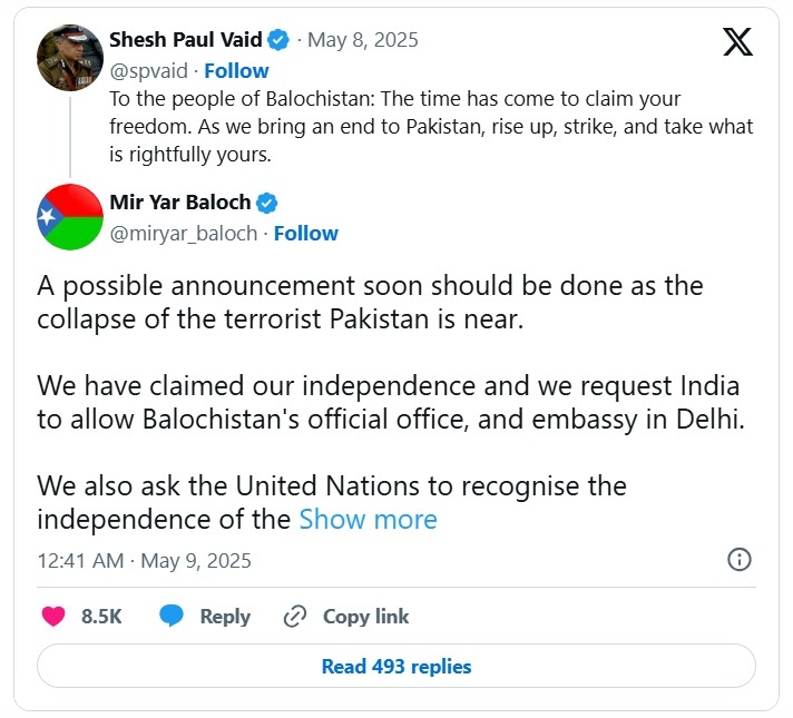 ભારત-પાકિસ્તાન તણાવ વચ્ચે, બલુચિસ્તાનની સ્વતંત્રતાની જાહેરાત કરવામાં આવી છે. આ જાહેરાત બલૂચ લેખક મીર યાર બલોચે કરી છે. મીર યાર બલોચે સોશિયલ મીડિયા પ્લેટફોર્મ ઠ પર એક લાંબી પોસ્ટ લખી છે અને બલુચિસ્તાનની સ્વતંત્રતાની ઘોષણા કરી છે. બલૂચ લેખક મીર યાર બલોચે બલૂચિસ્તાનની સ્વતંત્રતાની ઘોષણા કરી અને સંયુક્ત રાષ્ટ્રને તેનું શાંતિ મિશન મોકલવાની માંગ કરી. આ સાથે તેમણે દિલ્હીમાં ભારત પાસેથી પોતાના માટે એક દૂતાવાસની પણ માંગણી કરી છે.