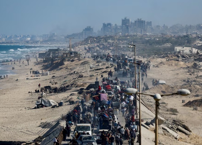 શનિવારે હજારો પેલેસ્ટિનિયનો ગાઝાના દરિયાકાંઠે ઉત્તર તરફ ધસી આવ્યા, પગપાળા, કાર અને ગાડીઓ દ્વારા તેમના ત્યજી દેવાયેલા ઘરો તરફ પાછા ફર્યા કારણ કે ઇઝરાયલ અને પેલેસ્ટિનિયન આતંકવાદી જૂથ હમાસ વચ્ચે યુદ્ધવિરામ ચાલુ હોય તેવું લાગતું હતું.