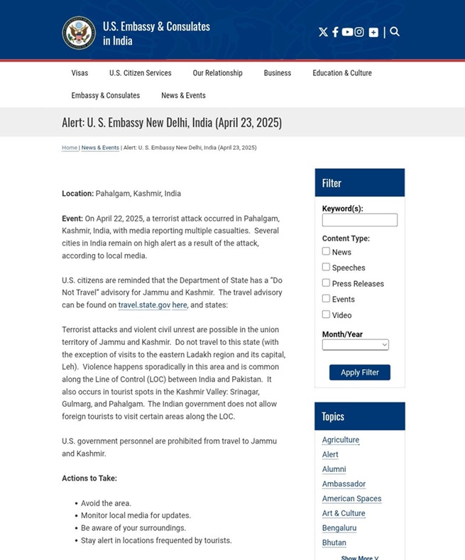 ભારતના જમ્મુ-કાશ્મીરમાં આવેલ પહલગામમાં થયેલ દુ:ખદ અને ર્નિદય આતંકી હુમલા બાદ અમેરિકાની સરકારે તેમના નાગરિકો માટે એક એડવાઈઝરી જાહેર કરી હતી જેમાં અમેરિકી તંત્ર દ્વારા પોતાના નાગરિકોને જમ્મુ-કાશ્મીર ન જવાની સલાહ આપવામાં આવી હતી અને ખાસ કરીને સ્થાનિક મીડિયા પર નજર રાખવા સલાહ આપી છે.