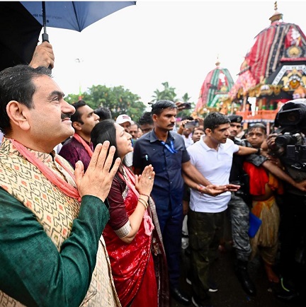 ઉદ્યોગપતિ અને અદાણી ગ્રુપના ચેરમેન ગૌતમ અદાણી અને તેમના પત્ની પ્રીતિ અદાણીએ શનિવારે ઓડિશાના મંદિર નગરી પુરીની મુલાકાત લીધી હતી અને શુક્રવારથી શરૂ થયેલા ૯ દિવસના ઉત્સવ, ભગવાન જગન્નાથ રથયાત્રામાં ભાગ લીધો હતો. અદાણી અને તેમની પત્નીએ જગન્નાથ મંદિરમાં પ્રાર્થના પણ કરી હતી અને પુરીના ઇસ્કોન કિચનમાં સેવા પણ કરી હતી, જ્યાં રથયાત્રામાં ભાગ લેનારા હજારો ભક્તો માટે ‘પ્રસાદ‘ અને ભોજન તૈયાર કરવામાં આવે છે.