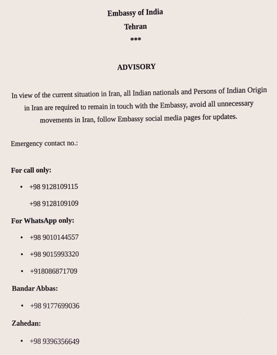 ઈરાન અને ઇઝરાયલ વચ્ચેનો સંઘર્ષ સતત વધી રહ્યો હોવાથી, તેહરાનમાં ભારતીય દૂતાવાસે રવિવારે આ પ્રદેશમાં રહેતા ભારતીય નાગરિકો માટે એક સલાહકાર જારી કર્યો. સોશિયલ મીડિયા પ્લેટફોર્મ ઠ પર જઈને, ભારતીય દૂતાવાસે કટોકટીની સ્થિતિમાં ભારતીય નાગરિકોનો સંપર્ક કરવા માટે હોટલાઇન નંબરો જારી કર્યા.