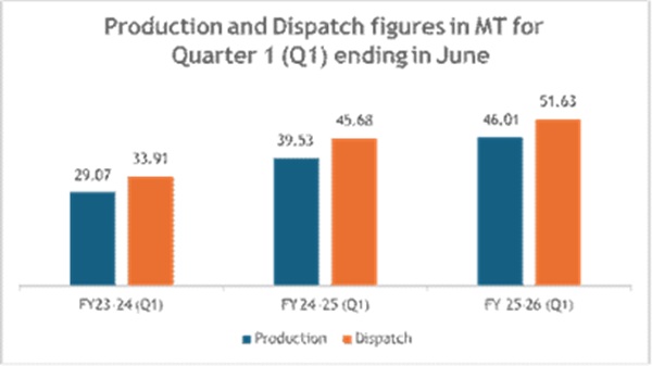 નાણાકીય વર્ષ ૨૦૨૫-૨૬ના પ્રથમ ત્રિમાસિક ગાળામાં વાર્ષિક ધોરણે મજબૂત વૃદ્ધિ જાેવા મળી છે, જેમાં ઉત્પાદનમાં ૧૬.૩૯% અને ડિસ્પેચમાં ગયા વર્ષના સમાન સમયગાળાની તુલનામાં ૧૩.૦૩%નો વધારો થયો છે. આ સુધારેલી કાર્યક્ષમતા અને ખાણકામ ક્ષમતાના વધુ સારા ઉપયોગને પ્રતિબિંબિત કરે છે.