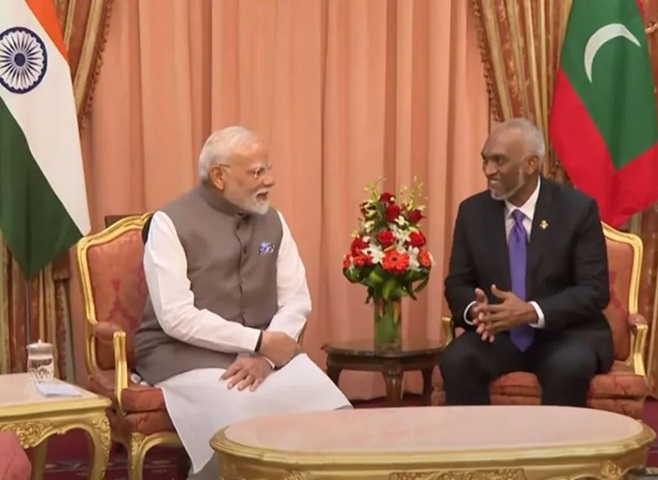 પ્રધાનમંત્રી નરેન્દ્ર મોદી શુક્રવારે માલદીવના રાષ્ટ્રપતિ મોહમ્મદ મુઇઝુને મળ્યા, રાજધાની માલેના રિપબ્લિક સ્ક્વેર ખાતે ઔપચારિક સ્વાગત કર્યા પછી તરત જ. પ્રધાનમંત્રીની સાથે વિદેશ મંત્રી (EAM) ડૉ. એસ જયશંકર, રાષ્ટ્રીય સુરક્ષા સલાહકાર (NSA) અજિત ડોભાલ, વિદેશ સચિવ વિક્રમ મિસરી અને અન્ય વરિષ્ઠ સરકારી અધિકારીઓ પણ હતા.