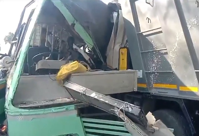 આ દુર્ઘટના શુક્રવારે તમિલનાડુના કેજી કંડિગાઈ વિસ્તારમાં તિરુથન્ની પાસે થઈ હતી. મુસાફરોથી ભરેલી બસ પાછળથી આવતી ટિપર લારી સાથે અથડાઈ હતી, જેના કારણે લોકોમાં ગભરાટ ફેલાયો હતો. બસના આગળના ભાગને ભારે નુકસાન થયું હતું.