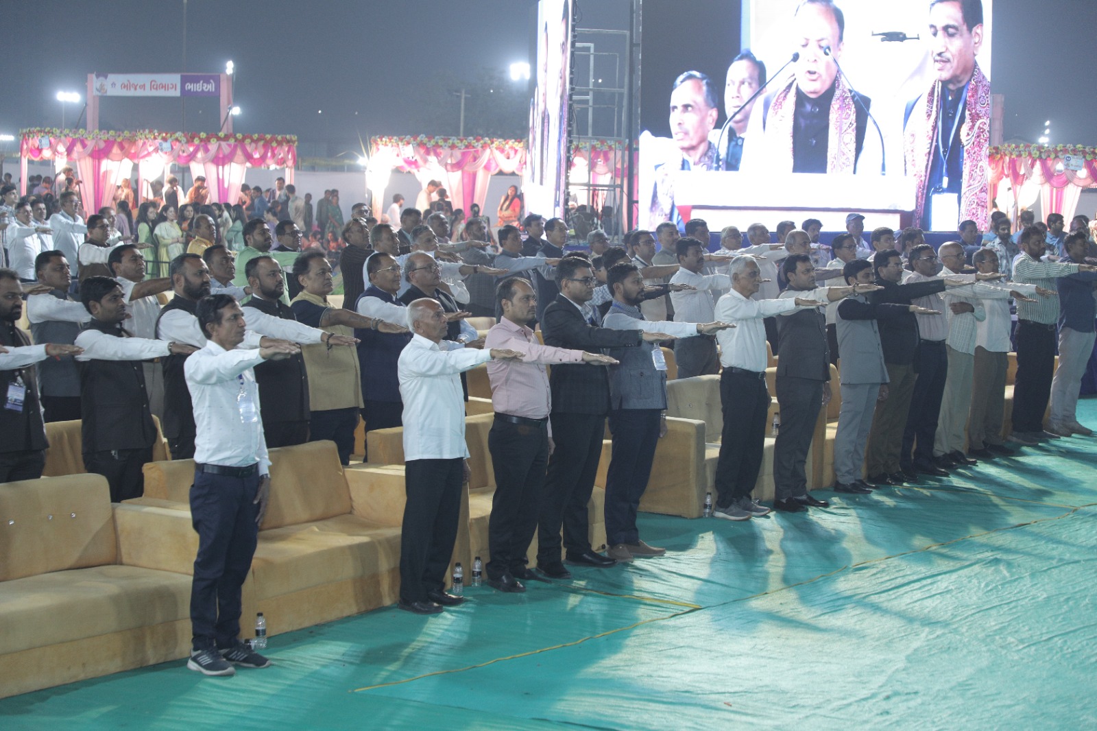 સમાજમાં રાષ્ટ્રીય ચેતના જાગૃત થાય તેવા હેતુથી શુભ પ્રસંગે રાષ્ટ્રગીત ગાનની પરંપરા શ્રી સૌરાષ્ટ્ર પટેલ સેવા સમાજ સુરતે શરુ કરી છે. સાંજે ૫ કલાકે વરપક્ષ – કન્યાપક્ષના આગમન બાદ સર્વ પ્રથમ ગંગાસ્વરૂપ બહેનોના હસ્તે દીપ પ્રાગટ્ય વિધિ કરવામાં આવી હતી. ત્યારબાદ ઉપસ્થિત વિશાળ જન સમુહે પૂરા માન – સન્માન અને રાષ્ટ્રભાવ સાથે ‘રાષ્ટ્રગીત’ નું ગાન કર્યું હતું. ત્યાર બાદ ૭૧ લગ્ન મંડપમાં વર – કન્યાની લગ્ન સંસ્કારવિધીનો પ્રારંભ થયો હતો.