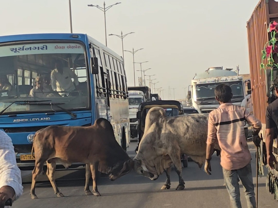સુરત જિલ્લાના કીમ ચાર રસ્તા નજીક નેશનલ હાઈવે 48 ના સર્વિસ રોડ પર બે રખડતા આખલાઓ વચ્ચે લડાઈ થઈ હતી. આ ઘટનાને કારણે લાંબા સમય સુધી ટ્રાફિક જામના દ્રશ્યો સર્જાયા હતા, જેનાથી વાહનચાલકોને મુશ્કેલી પડી હતી.