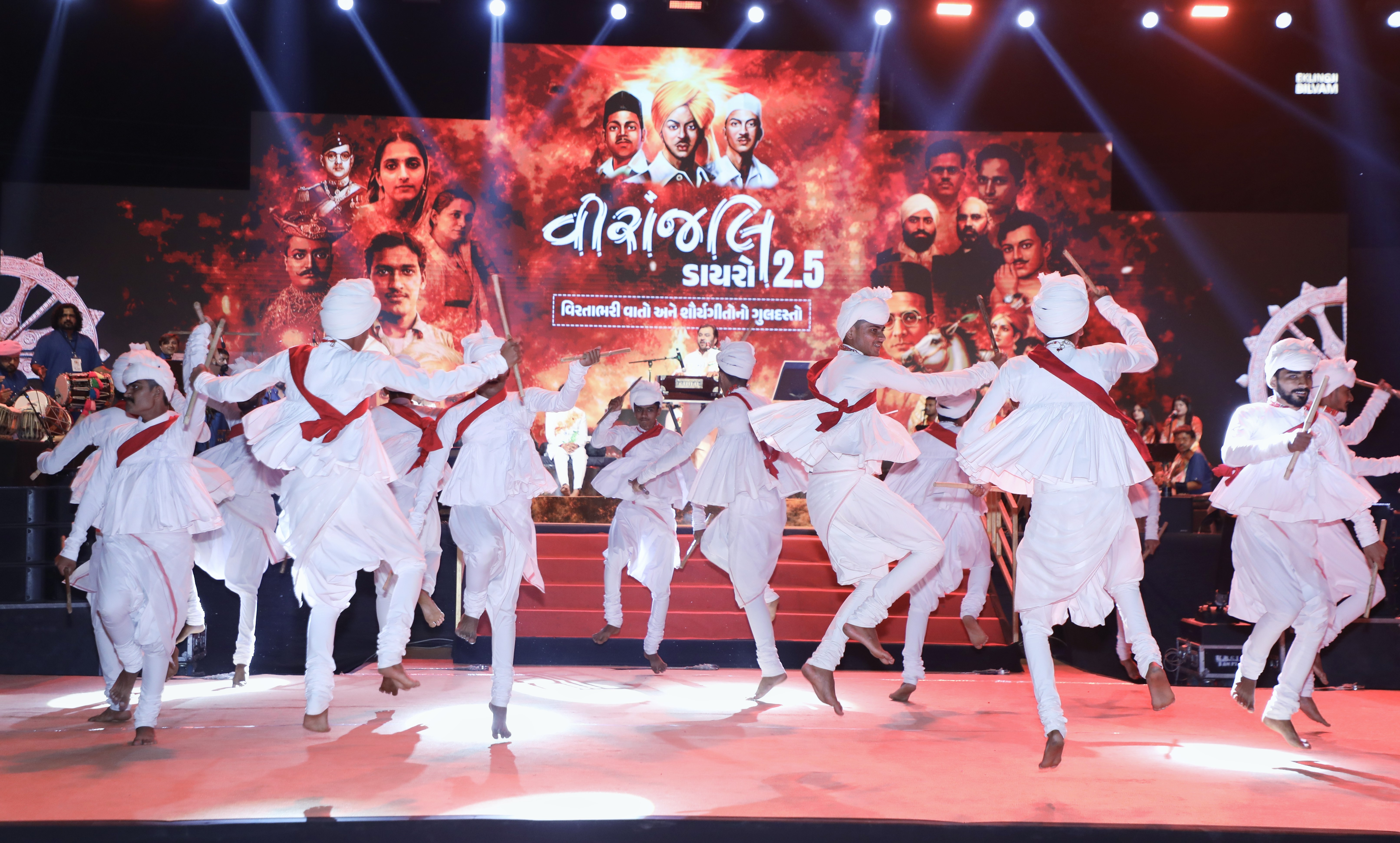 સાણંદની ધરા પર વીરતા, શૌર્ય અને અડગ દેશભક્તિના ત્રિવેણી સંગમ સમાન “વીરાંજલિ ડાયરો 2.5”નું ભવ્ય આયોજન કરવામાં આવ્યું હતું. મુખ્યમંત્રી ભૂપેન્દ્ર પટેલ અને નાયબ મુખ્યમંત્રી હર્ષ સંઘવીની પ્રેરક ઉપસ્થિતિમાં યોજાયેલા આ કાર્યક્રમે ઉપસ્થિત હજારોની જનમેદનીમાં રાષ્ટ્રપ્રેમનો નવો જુવાળ ફૂંક્યો હતો. વીરાંજલિ સમિતિ અને GTPLના સંયુક્ત ઉપક્રમે આયોજિત આ કાર્યક્રમમાં દેશના અમર શહીદોને ગૌરવભેર શ્રદ્ધાંજલિ અર્પણ કરવામાં આવી હતી.