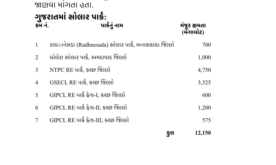 ભારત સરકારે 28 ફેબ્રુઆરી, 2026 સુધીમાં “સોલાર પાર્ક અને અલ્ટ્રા-મેગા સોલાર પાવર પ્રોજેક્ટ્સ વિકાસ” યોજના હેઠળ 54 સોલાર પાર્કને મંજૂરી આપી છે. આમાંથી, 7 સોલાર પાર્ક ગુજરાતમાં છે. આ યોજના હેઠળ 12,150 મેગાવોટ (MW) મંજૂર વીજ ઉત્પાદન ક્ષમતા સાથે ગુજરાત રાજ્ય પ્રથમ ક્રમે છે. કેન્દ્રીય નવી અને નવીનીકરણીય ઊર્જા અને ઊર્જા રાજ્યમંત્રી શ્રી શ્રીપાલ યેસો નાઈકે 10 માર્ચ, 2026 ના રોજ રાજ્યસભામાં સાંસદ શ્રી પરિમલ નથવાણી દ્વારા પૂછવામાં આવેલા પ્રશ્નનો લેખિત જવાબ આપતા આ માહિતી ઉપબલ્ધ બનાવી હતી.