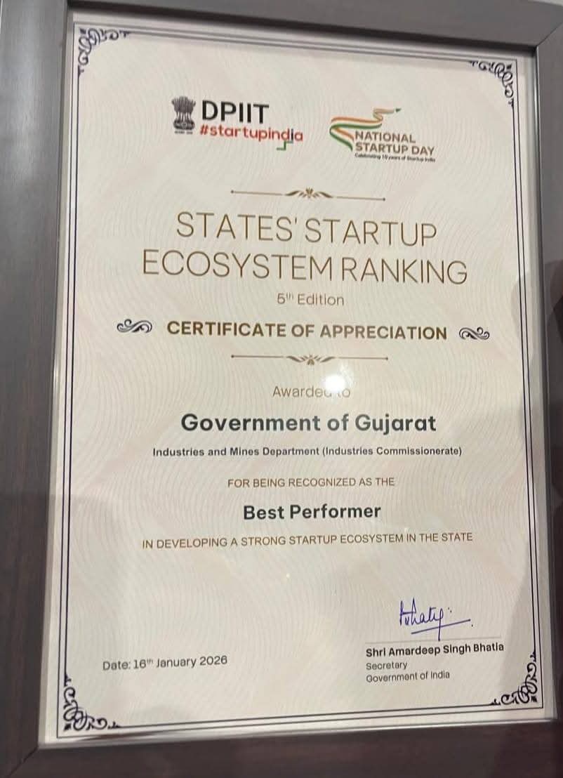 કેન્દ્ર સરકારના ‘રાજ્યો માટેના સ્ટાર્ટઅપ રેન્કિંગ – પાંચમી આવૃત્તિ’ (જાન્યુઆરી 2023 થી નવેમ્બર 2024) માં ગુજરાત રાજ્યએ સતત પાંચમી વખત ‘બેસ્ટ પરફોર્મર’ તરીકેનું સ્થાન જાળવી રાખેલ છે.