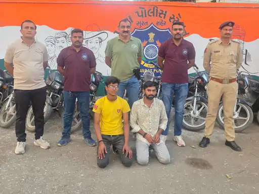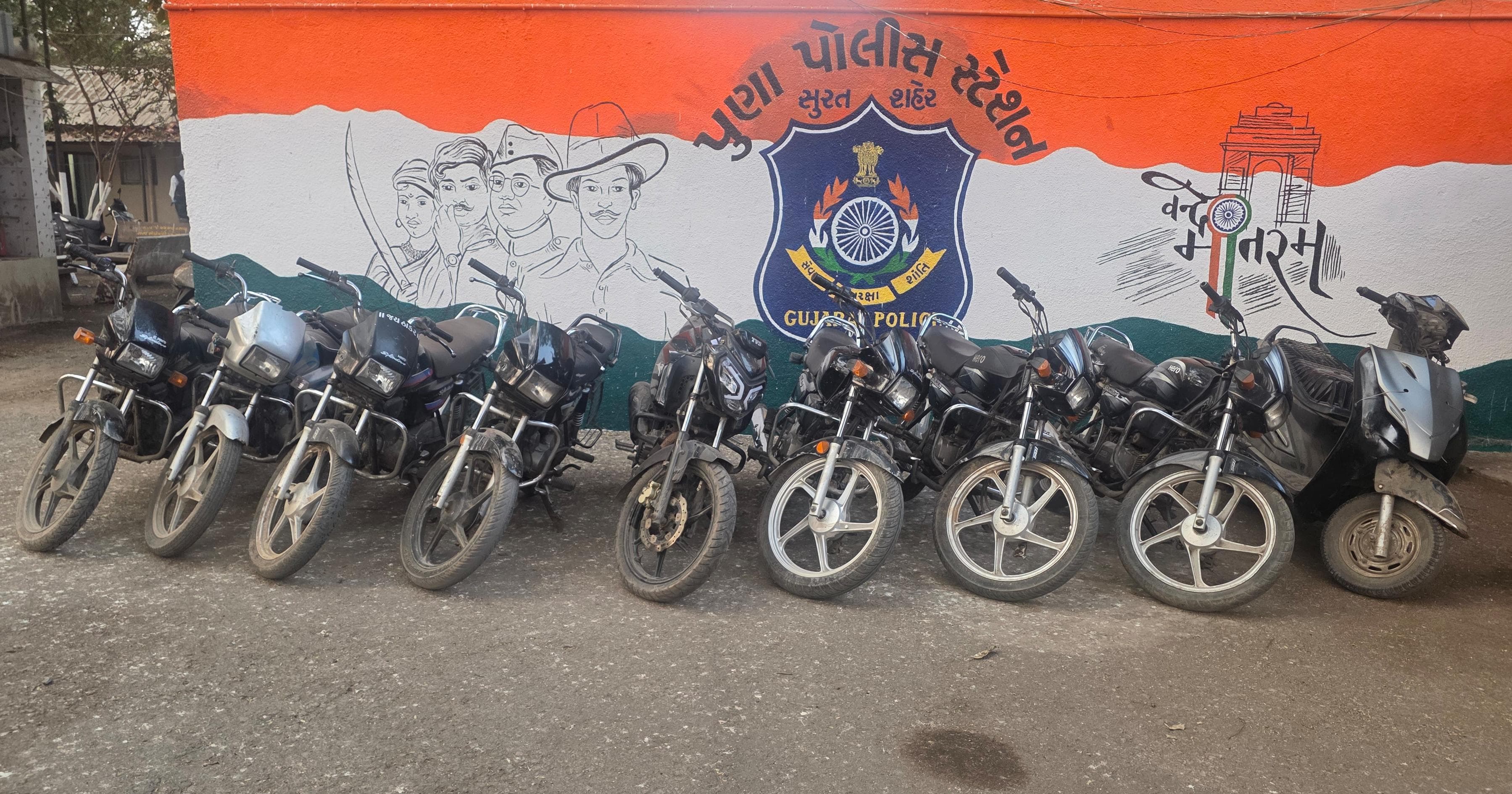 સુરત શહેર અને ગ્રામ્ય વિસ્તારોમાં છેલ્લા ઘણા સમયથી વધી રહેલી વાહનચોરીની ઘટનાઓને ડામવા માટે સુરત પોલીસ એક્શન મોડમાં છે. આ દરમિયાન પુણા પોલીસ સ્ટેશનની ટીમને એક મોટી સફળતા મળી છે. પોલીસે બાતમીના આધારે ઓપરેશન હાથ ધરીને વાહનચોરીનો ભેદ ઉકેલી નાખ્યો છે અને કુલ 9 મોટરસાયકલ રિકવર કરી છે.