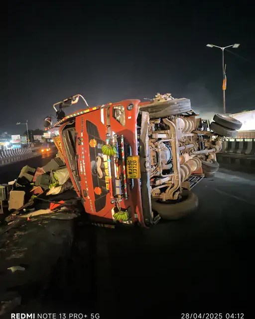 એરોમા સર્કલ નજીક પુલ ઉપર કેળા ભરેલા ટેમ્પાનું ટાયર ફાટતાં પલટી મારી ગયો