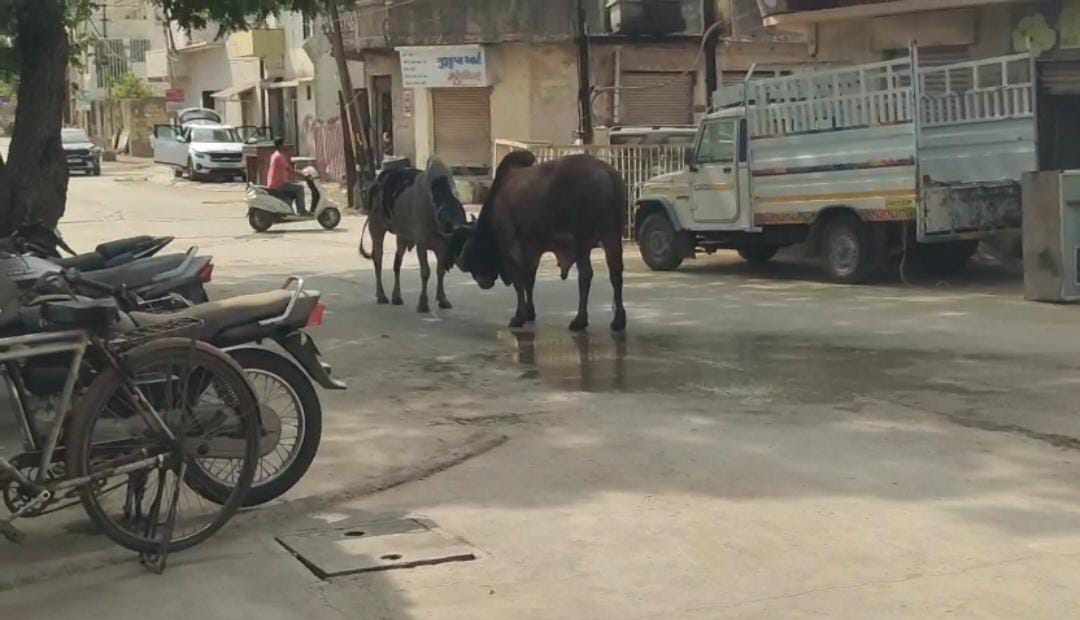 જેતપુરના કણકિયા પ્લોટ વિસ્તારમાં આખલાનો આતંક, બે આખલા વચ્ચે રોડ ઉપર યુદ્ધ જામ્યું
