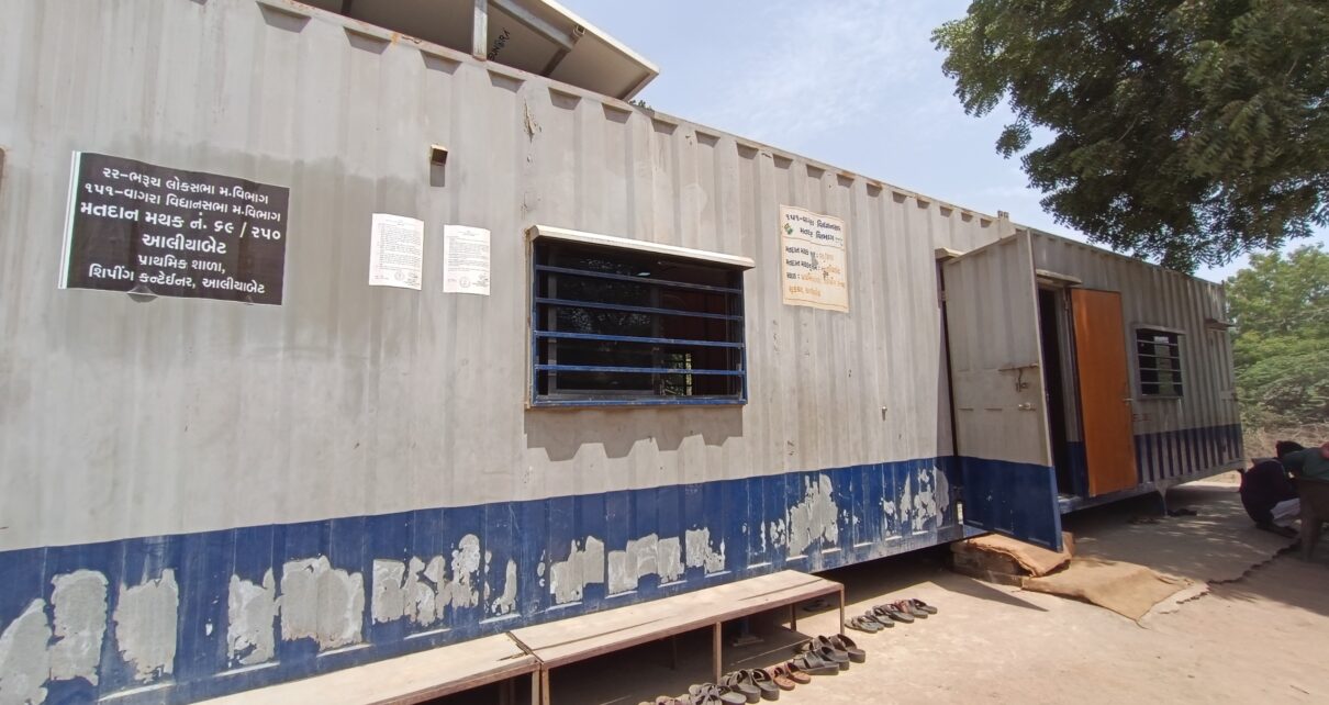 ચોતરફ પાણીથી ઘેરાયેલા આલિયાબેટના મતદારો માટે ચૂંટણી તંત્ર દ્વારા શિપિંગ કન્ટેનરમાં ઉભું કરાયું મતદાન મથક