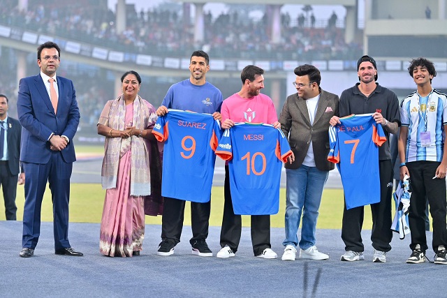 ICC ચેરમેન જય શાહે નવી દિલ્હી ખાતે આયોજિત એક કાર્યક્રમ દરમિયાન ફૂટબોલ આઇકન લિયોનેલ મેસ્સી, લુઇસ સુઆરેઝ અને રોડ્રિગો ડી પોલને મળ્યા