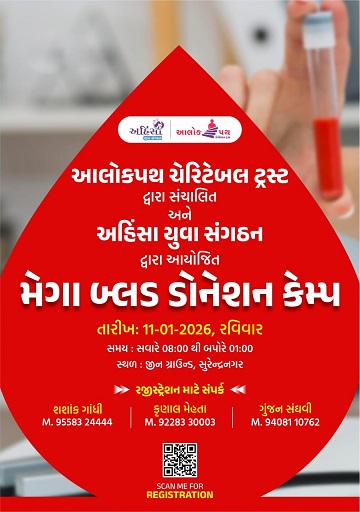 આલોકપથ ચેરિટેબલ ટ્રસ્ટ દ્વારા સંચાલિત અને અહિંસા યુવા સંગઠન દ્વારા આયોજિત મેગા બ્લડ ડોનેશન કેમ્પ નું ભવ્ય આયોજન તારીખ 11-01-2026, રવિવાર ના રોજ સવારે 8 થી બપોરે 1 કલાક સુધી જીન ગ્રાઉન્ડ, સુરેન્દ્રનગર ખાતે કરવામાં આવ્યું છે. આ બ્લડ ડોનેશન કેમ્પનો મુખ્ય હેતુ સમાજમાં માનવતાની ભાવના મજબૂત બનાવવાનો તેમજ જરૂરિયાતમંદ દર્દીઓને સમયસર રક્ત ઉપલબ્ધ કરાવવાનો […]