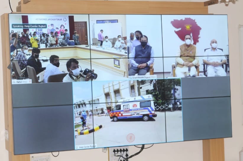 રાજકોટ શહેર સિવિલ હોસ્પીટલના કોરોના વોર્ડમાંથી વિડીયો કોન્ફરન્સ મારફતે કોરોનાની સારવાર લઇ રહેલા દર્દી સાથે વાત કરતા. મુખ્યમંત્રીશ્રી વિજયભાઈ રૂપાણી