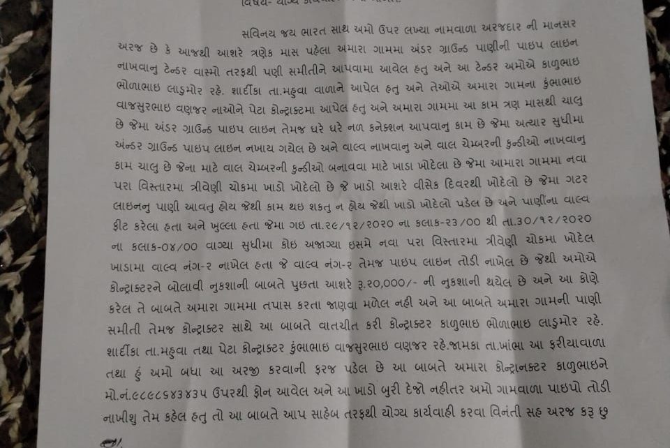 ખાંભા તાલુકાના જામકા ગામે ગ્રામ પંચાયત ની પાણીની પાઇલાઇન તોડી નાખતા અજાણ્યા શખ્સ સામે પોલીસ ફરિયાદ દાખલ કરતાં સરપંચ ભોળાભાઈ ખસીયા.