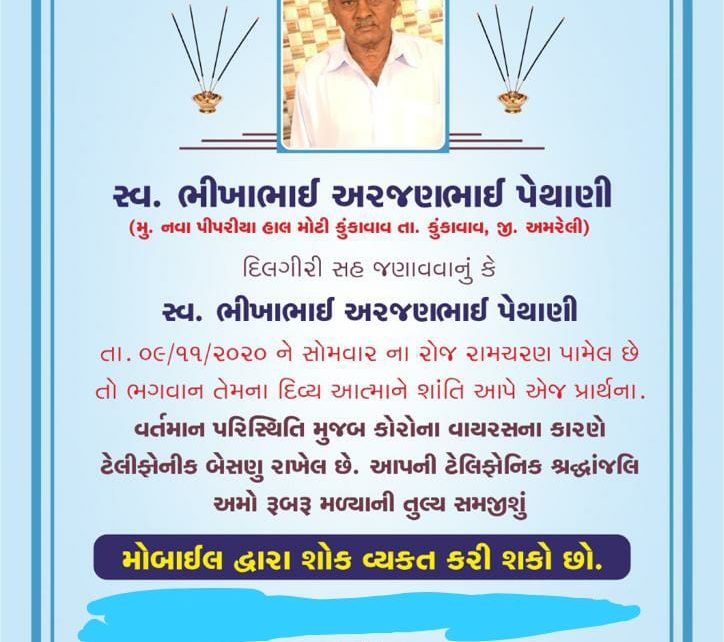 મોટી કુંકાવાવ થી લી.ફુલભાઈ ભીખાભાઈ પેથાણી ના જયશ્રીકૃષ્ણ વાંચશો. દિલગીરી સાથે જણાવવાનું કે અમારા પિતાશ્રી ભીખાભાઈ અરજણભાઈ પેથાણી (ઉંમર વર્ષ 78) સવંત ૨૦૭૬ ના આસો વદ ૮ ને સોમવાર તારીખ 9/ 11/ 2020 ના રોજ સ્વર્ગવાસી થયા છે તેમની દશા શ્રાધ્ધક્રિયા કારતક સુદ પાંચમને ગુરૂવાર તારીખ 19 /11/ 2020 ના રોજ તેમજ તેની ઉત્તર ક્રિયા […]